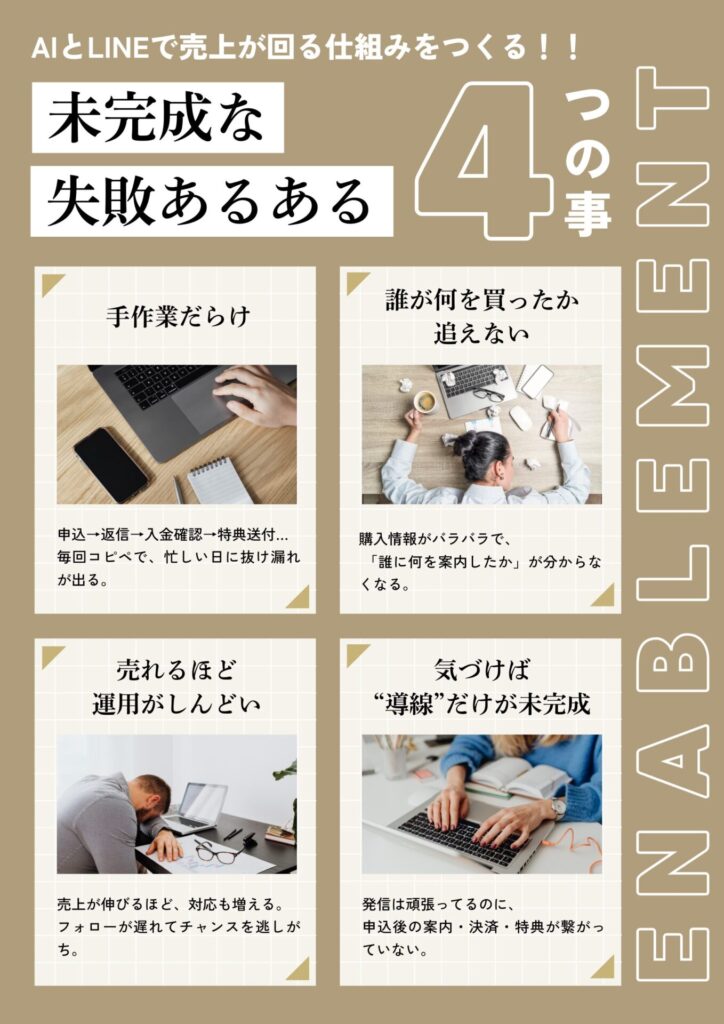 発信は頑張ってるのに、申込後の流れが未完成。決済・特典・フォロー・計測がバラけて、成果が読めない。
