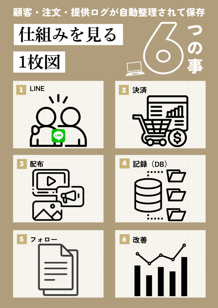 この6ステップに沿って整えると、顧客・注文・配布ログが自動で残り、“手作業”と“追えない”が消えていきます。
