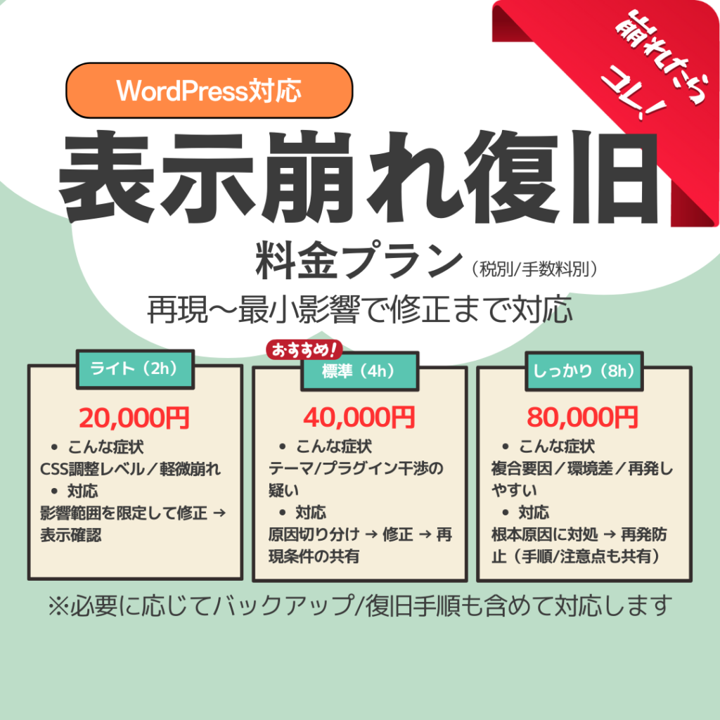 - 再現・現状確認+原因切り分け(CSS/テーマ/プラグイン/JS等)