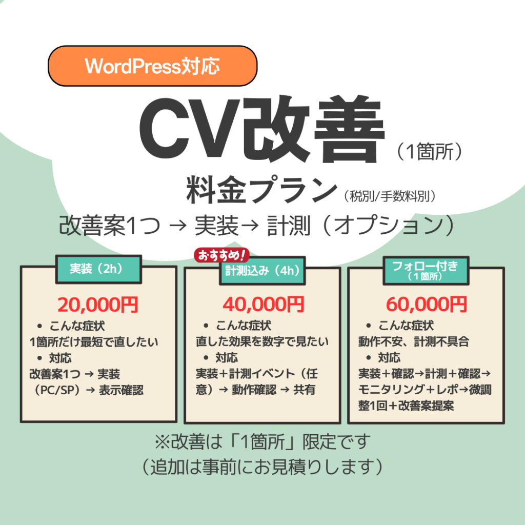 - 月次点検(主要導線・フォーム送信・簡易計測チェック等)