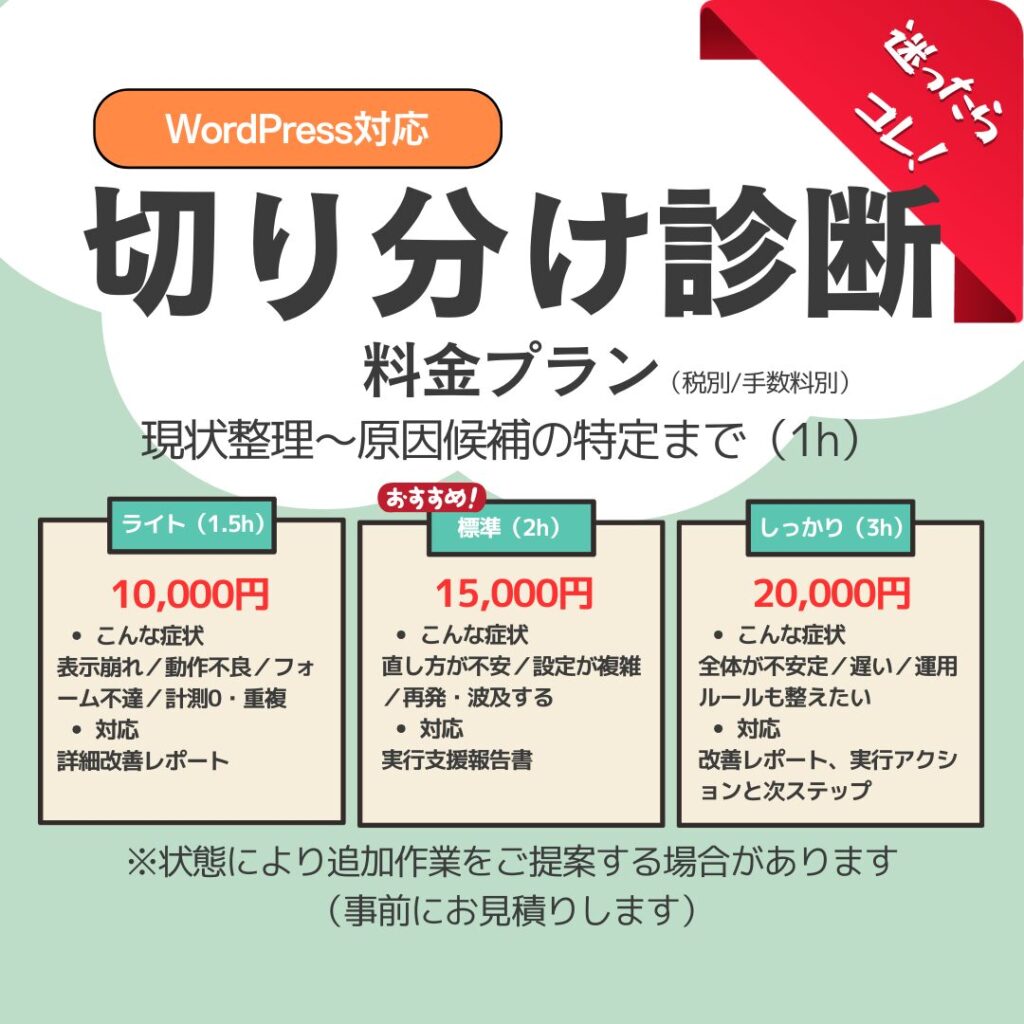 - 原因候補の切り分け(テーマ/プラグイン/設定/キャッシュ/計測など)